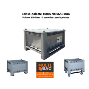Caisse-palette 1000x700x650 mm avec fond et parois pleins ainsi que 4 pieds. Sa capacité de stockage est de 300 litres. La charge maximale autorisé par cette caisse palette est de 300 kg et sa résistance au gerbage de 1200 kg.